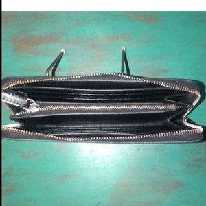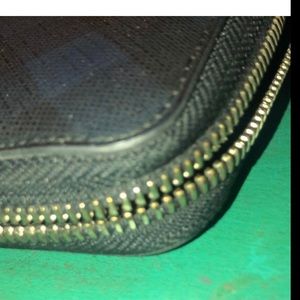 This authentic Burberry black and navy leather London Check wallet features an all around zip fastening, an embossed logo, multiple card slots and an internal zipped pocket. Lining: 100% polyester. Outer: 100% leather. I believe this was sold as a men’s wallet, but it fits both men’s and women’s needs. Condition is excellent with only slight traces of wear or tear. Please see my photos. This is a great Burberry wallet.
