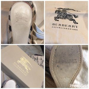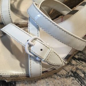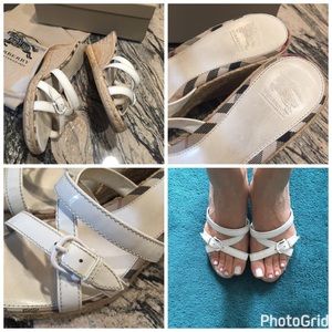 Awesome Burberry Wedges. Size 41. White leather wedges with jute wrapped 3 inch heels and classic nova-check trim. Excellent condition with slight wear/dirt to footbeds/soles. Can not see when wearing. Very comfortable! Includes dust bag and original box! Super fast shipping on all my items! Offers are accepted by using the blue offer button! No trades!