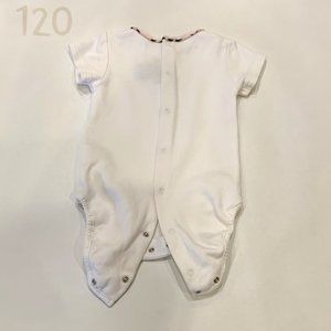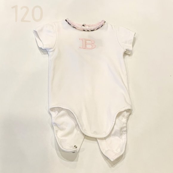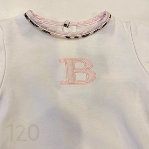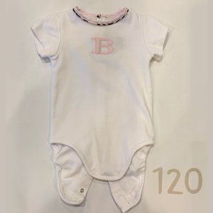 This white Burberry onesie will make your princess look like one too. It features a pink embroidered B on the chest, as well as pink and Burberry check trim around the neckline. Buttons up the entire back and around the leg openings, make it a breeze to change a diaper or change outfits...but you won't want to change her out of this outfit. Purchased at Neiman Marcus. Size 6 months.