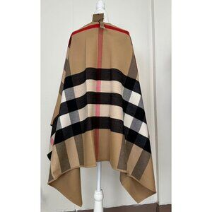 •Step into a world of elegance with the Burberry 'Charlotte' Wool Poncho Cape. This luxurious cape is expertly crafted from the finest Merino wool, offering unmatched comfort and quality. The cape features a unique two-sided design; one side is adorned with a sleek, solid color, while the other boasts Burberry's iconic check pattern.