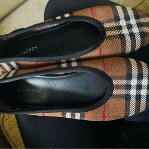 Elegant Burberry flats with iconic checkered pattern. Features brown, black, and white tones. Perfect for stylish comfort.