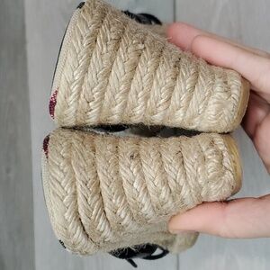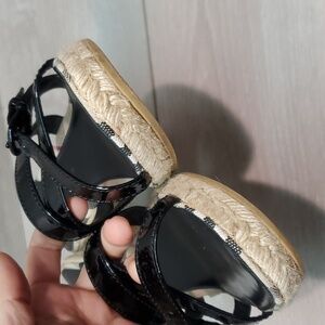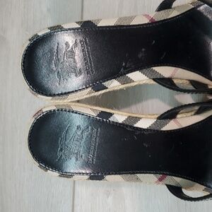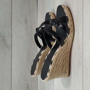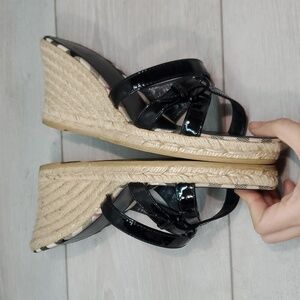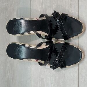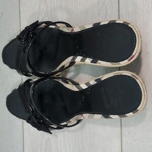 Burberry Espadrille wedges. Black patent leatber crossed straps with Nova Check classic plaid around the edge. Jute wrapped wedge heel that is approximately 3 1/4" tall with 3/4" platform.