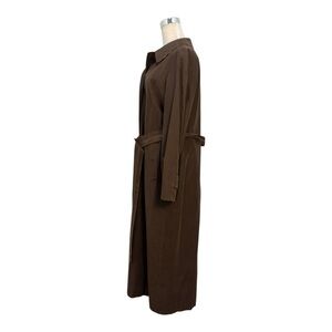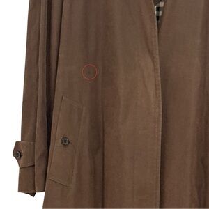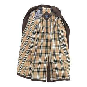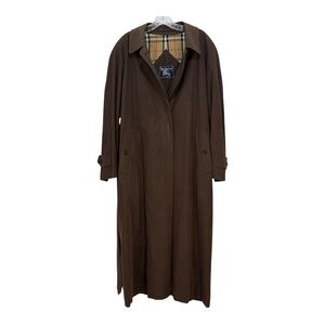 The Burberry Women's M/L Trench Coat in Chocolate Brown is a stylish and versatile outerwear option for women. Made from polyester with a check pattern, this 53" long length trench coat features a classic button closure and belted waist. Perfect for various occasions including travel, parties, casual outings, and business meetings, this coat is designed for all seasons and comes in a timeless brown color. The Burberry brand ensures quality, style, and sophistication, making this trench coat a must-have piece for any fashion-forward wardrobe. With no definitive size tag the estimated size of M/L laying flat, the measurements underarms across the back is 22" and sleeve length from center of neck to bottom of sleeve is 33".