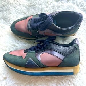 Elegant sneakers with a blend of pink and green. Perfect for casual wear.