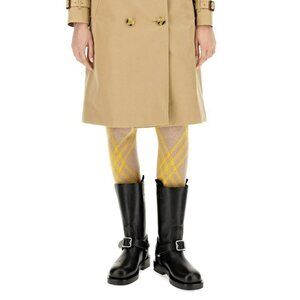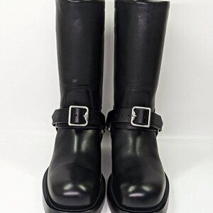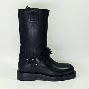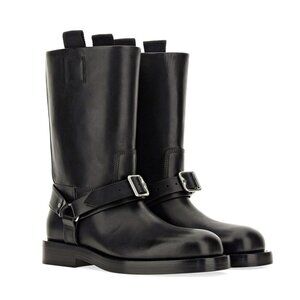 The Burberry Saddle Low Harness Strap Boots for women in size 39 feature a classic round toe and a slip-on design with a pull-on closure. These knee-high riding boots in black leather with a block heel are adorned with a stylish buckle accent, perfect for a casual and equestrian-themed look. Made in Italy, they are suitable for summer, fall, and spring seasons, combining leather and textile lining for comfort and style. Ideal for adding a touch of biker or equestrian flair to your outfit, these Burberry boots are a fashionable choice for any wardrobe.