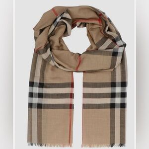 This is an authentic BURBERRY Wool Silk Gauze Giant Check Lightweight Scarf in Archive Beige. The scarf features the traditional tan, white, red and black Burberry check with a fringe border.