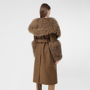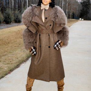 Wool cashmere blend trench coat in camel color with removable fur collar.