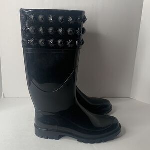 Burberry black rubber mod-calf rain boots with studded detail along top cuffs. Rounded toe and block heel with rubber treading outsole. Signature plaid lining on insole. Minor scuff on left toe, otherwise in excellent condition