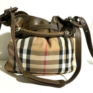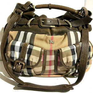 Burberry brown leather house check canvas monogram satchel handbag with silver tone hardware 3 compartment 3 pockets at interior wall 1 zip closure fabric lining 2 snap pocket at front logo at front & hardware it have handle and removable and adjustable shoulder strap minor scratches hight 13” width 16” depth 2.5” strap drop 9” shoulder strap 25” adjustable The dimensions are based on approximately measurements before placing an order please check take a moment to view all photos using feature for a closer look The dimensions are based on approximately measurements before placing an order please check take a moment to view all photos using feature for a closer look