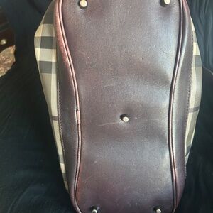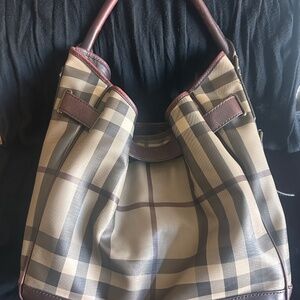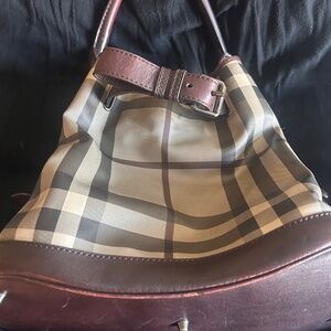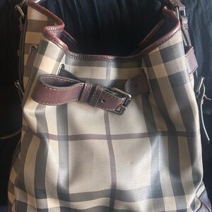 Barely used Burberry bucket bag . Leather handle and base. Deep can hold so much two internal zippered pockets .