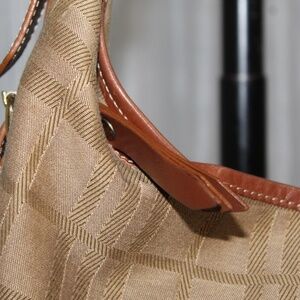 Burberry canvas body with leather trim shoulder bag. Flat leather handle. Top zip closure. Interior zip and slip pockets.