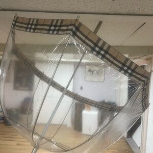 Burberry extended umbrella with a clear Canopy and Burberry design on the shaft.