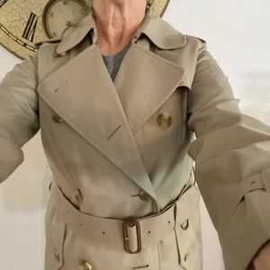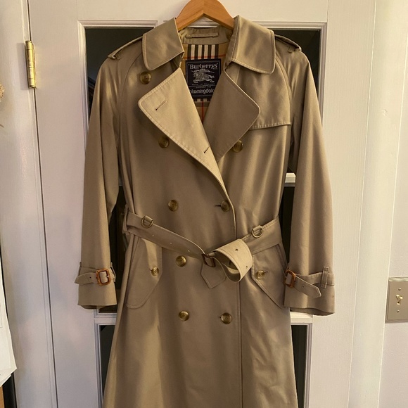 long trench coat with metal details on belt. Burberry classic design liner. normal wear on leather belt buckles. no rips excellent condition