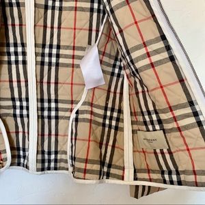 This is a quilted Burberry jacket. It’s been used but it’s still in great condition. The only flaw is that it has a few loose threads as shown in last pic, I’m sure they can be cut off or sewn back on but I’m not good at that. It’s a size xs and I would say it’s true to size.