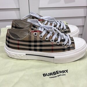 Burberry low top sneakers, lightly used as evident by the sole. 1 defect noted with the black strip as noted on one of the pictures. Original $650. Size European 38 = 7.5 in the USA
