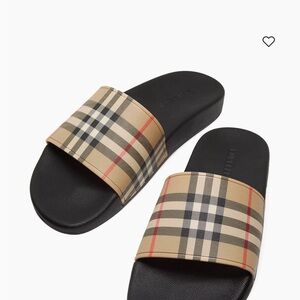 Burberry men’s Furley slide sandal with signature check pattern. Brand new. Size 43 (converts to a size 10). Last 7 pictures are of the actual slide. Comes with Burberry dust bag.