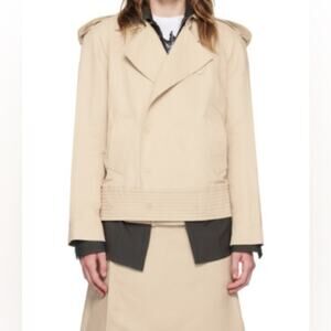 This off-centre canvas trench jacket offers a modern reinterpretation of a classic silhouette. Crafted in archive beige, the design features wide notch lapels, epaulettes, drop shoulders, and belted cuffs for a structured yet relaxed look. The asymmetric front button closure and straight hem add contemporary edge, while the viscose lining ensures comfort. Please note: this style runs big.