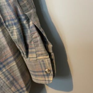The subtle shades of gray, cream, blue, orange and even green all blend wonderfully in this Burberry plaid collared button down. 100% imported soft cotton fabric, shirt can be washed and dried without having to dry clean. Buttoned sleeve. Looser fit with box pleat back. Size Medium