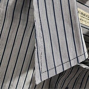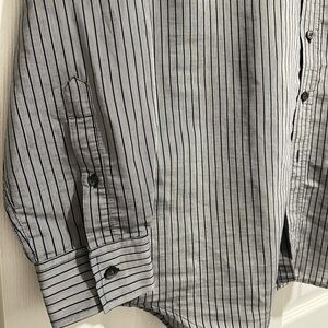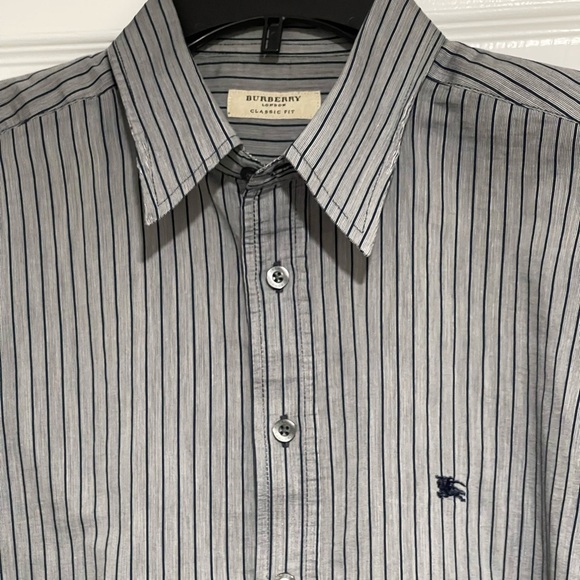 Burberry long-sleeve shirt, size L, grey and navy stripes. Pre-owned, good condition, except for unraveling collar sides (not very noticeable). Measurements: Sleeve - 25”, Shoulders - 19”, Chest - 23”, Length - 31”.