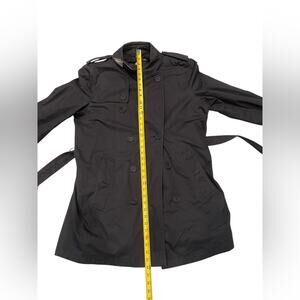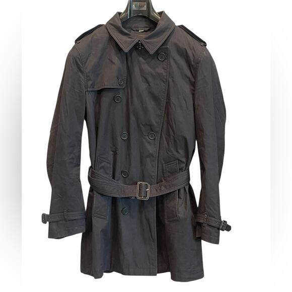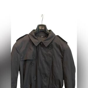 Elegant charcoal coat by Burberry. Features belted waist and button closure.