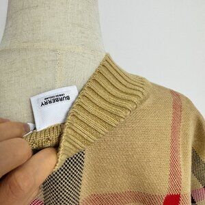 This Burberry cardigan features a full jacquard Vintage Check pattern. This merino wool-blend cardigan has a V-neck, drop shoulder, long sleeves, and ribbed edge.