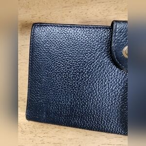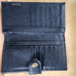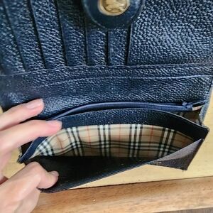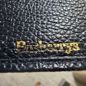 Burberrys vintage continental wallet. Burberry was originally known as burberrys until the name changed in 1999. This is a dark green/blue in color. Has the knight emblem on the front clasp and "burberrys" in gold printed interiorly.