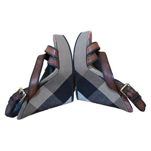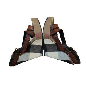 Burberry check heel with brown leather cross straps, approximately 6-inch heel. Size 38.5 = US 8