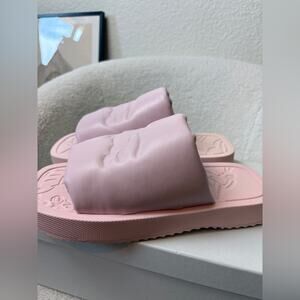 Stylish pink slide sandals with embossed design. Perfect for casual wear.
