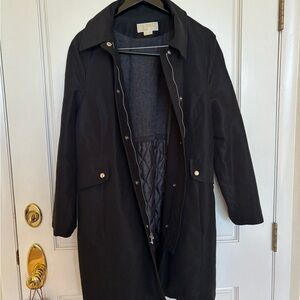 Elegant black wool trench coat with a double-breasted design. Perfect for a sophisticated look.