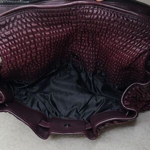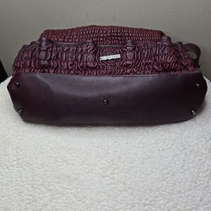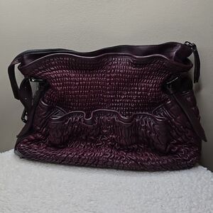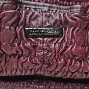 This is a guaranteed authentic BURBERRY Ruched Leather Elgin. This bag is done in a black and burgundy ruched leather. This interior is done in a black textile and features a zipper pocket. This bag has two pockets on the outside.