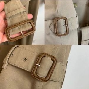 Burberry's classic tan poplin trench coat ...All the classic trench coat details are here, epaulets, storm flap, self belt, pocket flaps, raglan sleeves sleeve buckle bands, deep back vent with button tab. Size: 12 Long (vintage sizing varies, please see measurements for modern sizing suggestion) Color: British Tan/Nova Check Double-breasted Matching belt Buttoned side pockets Nova check lining Back vent with button tab Newly dry cleaned The leather buckles show minor wear. Dual lining *does not include the removable liner Condition: a few small nail holes on front left near bottom. Dry cleaner could fix. . (see photos). Otherwise, excellent vintage condition. Does not include button-in liner. All leather buckles are in excellent condition. Approximate measurements (laid flat, all buttons fastened) Chest 21” Length 47” Please ask any questions you may have prior to purchase! No trades,