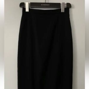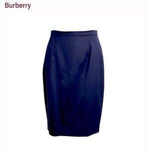 Luxurious Classic Burberry Navy Pencil Skirt with Side Pockets, Pleated Accents and Back Zip Closure. Burberry's 100% wool garment, knee-length skirt with back slit. Timeless Elegant Burberry Excellence!