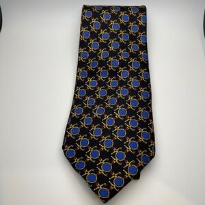 Repeating pattern of gold-colored circles on this dark navy tie, with a royal blue center and red accents.