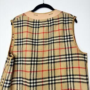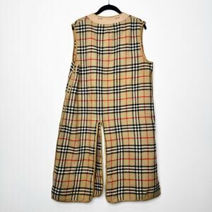 A rare and collectible Burberrys’ piece featuring the iconic camel Nova Check plaid in a longline sleeveless design. Originally made as a coat liner, this piece is now highly sought-after as a standalone vest, layering piece, or styled open over knitwear.