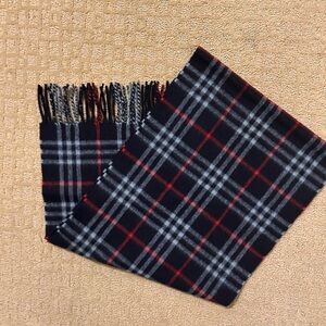 Burberry’s cashmere navy plaid nova check fringed scarf