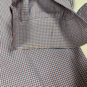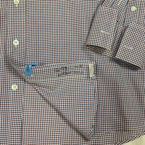 White button down long sleeve shirt with red and blue mini-check pattern. French cuffs.