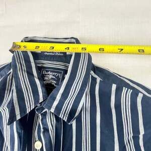 Vintage Burberrys of London Long Sleeve Striped Dress Shirt for men in excellent pre-owned condition. This classic navy and white striped button-down shirt is made from 100% imported cotton fabric and was made in the USA. It's a timeless piece perfect for both casual and formal occasions. No stains or holes.