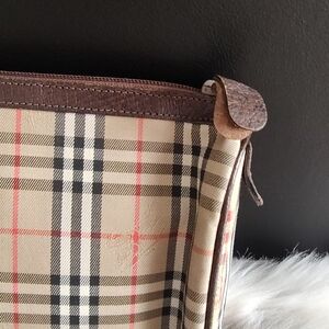 Classic Burberrys Nova Check clutch in excellent condition. This predates 1999, when Burberry changed the company name from Burberrys to Burberry. Made from canvas and leather. The interior is in fantastic shape, as is the exterior. The main callout are two spots on the exterior of the canvas, but they are faint and blend into the pattern (I tried to photograph them for you anyway). Corners are great!