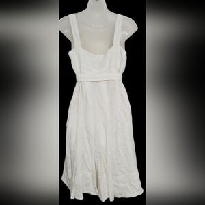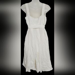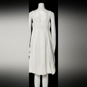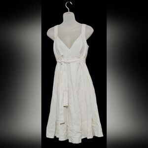 This Burberry white linen dress is the perfect summer piece. Crafted out of a linen blend, it has a fresh look to it. Designed with a sleeveless strapy top, open diamond neckline, and an above-the-knee hem,it features a tie-up belt just below the chest area which gives it a gathered look.