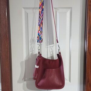 Burgandy Leather Crossbody Bag with a Geometric Print Strap, and a Leather strap