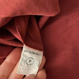 Silk dry clean only shell. Size, brand and material not marked. Fits like a 12 / L. Burgundy color. Small side slits. Simple staple for your wardrobe!