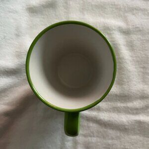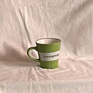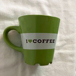 This avocado green and white mug has the Burger King logo with the word ‘café’ on one side of the mug/cup. The other side has ‘I <3 Coffee’. The inside of the mug is white.