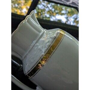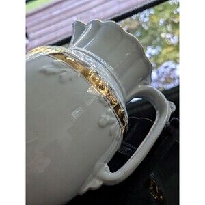 The vintage pitcher also includes a handle and is easy to fill, making it a practical choice for any kitchen. Its white and gold color scheme and Victorian style add a touch of elegance to any dining table. This one-of-a-kind piece is a must-have for collectors and enthusiasts alike.