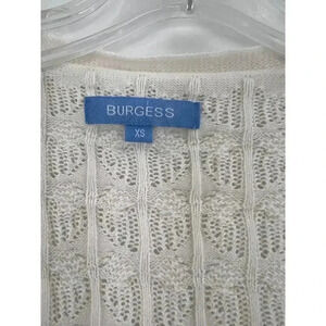 Elevate your wardrobe with this stylish Burgess cardigan sweater. The ivory color and open-knit crochet accents add a touch of elegance to any outfit, while the classic design and relaxed fit make it perfect for any occasion. The cashmere blend material is lightweight, breathable, and stretchy, providing ultimate comfort, and the long sleeves and pockets make it practical for everyday wear. This sweater is ideal for travel, workwear, business, party/cocktail, and casual events. The sweater is available in size XSMALL and is suitable for women who appreciate designer, classic, and preppy themes.
