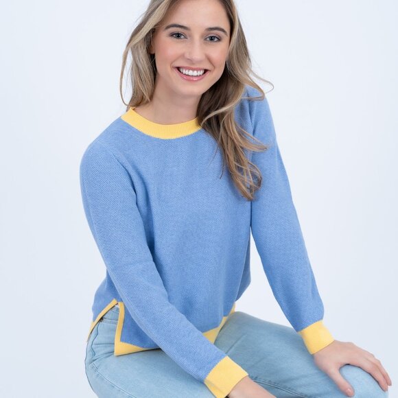 The seed stitch sweater design gives a slight texture without adding weight - great for those southern winter outings. The bright color combinations add to its light springtime feel. The Bea Sweater hits at the waist with a side slit for movability and added style. This lightweight sweater will be your everyday favorite.