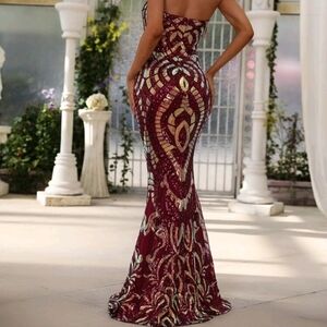 Burgundy All Over Print Sequined Mermaid Maxi Gown
