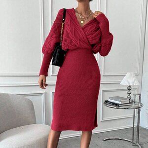 Burgundy Batwing Sleeve Split Hem Women's Knitted Sweater midi Dress