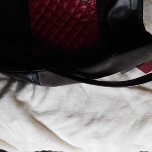 Used one season. Front and back are black leather. Front has quilted burgundy front pocket with clasp. Sides are a soft gray suede. Features zip top closure. Interior is in perfect condition.
