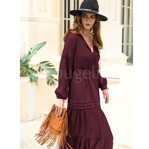 Burgundy Bohemian Maxi Dress Chiffon Neck Ties Long Sleeve Ruffle Hem Flowy