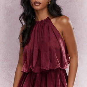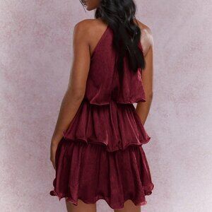 Burgundy Boho Women's Tiered Ruffle Halter Neck Mini Dress